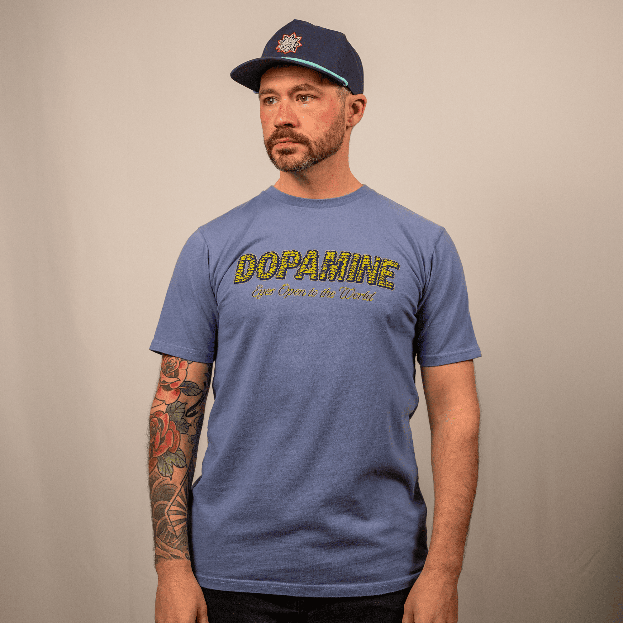 Crafted from 100% soft cotton and screen printed locally in Denver, CO, the light blue fabric sets a calm tone, while the purple and yellow eye graphics pop with intensity and meaning. Every element of this shirt has intention — from the placement of the design to the wearable comfort of its relaxed, true-to-size fit. It’s built for everyday wear but carries a message that lasts far beyond the moment.