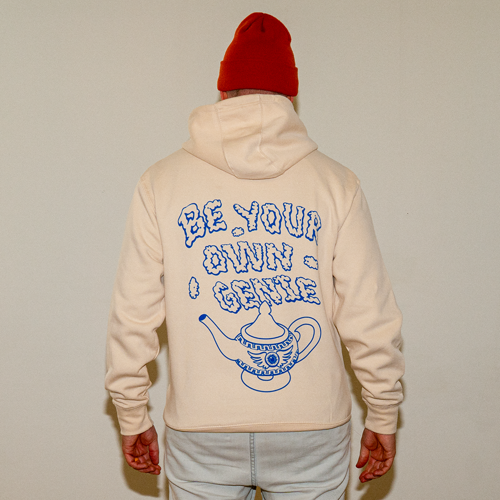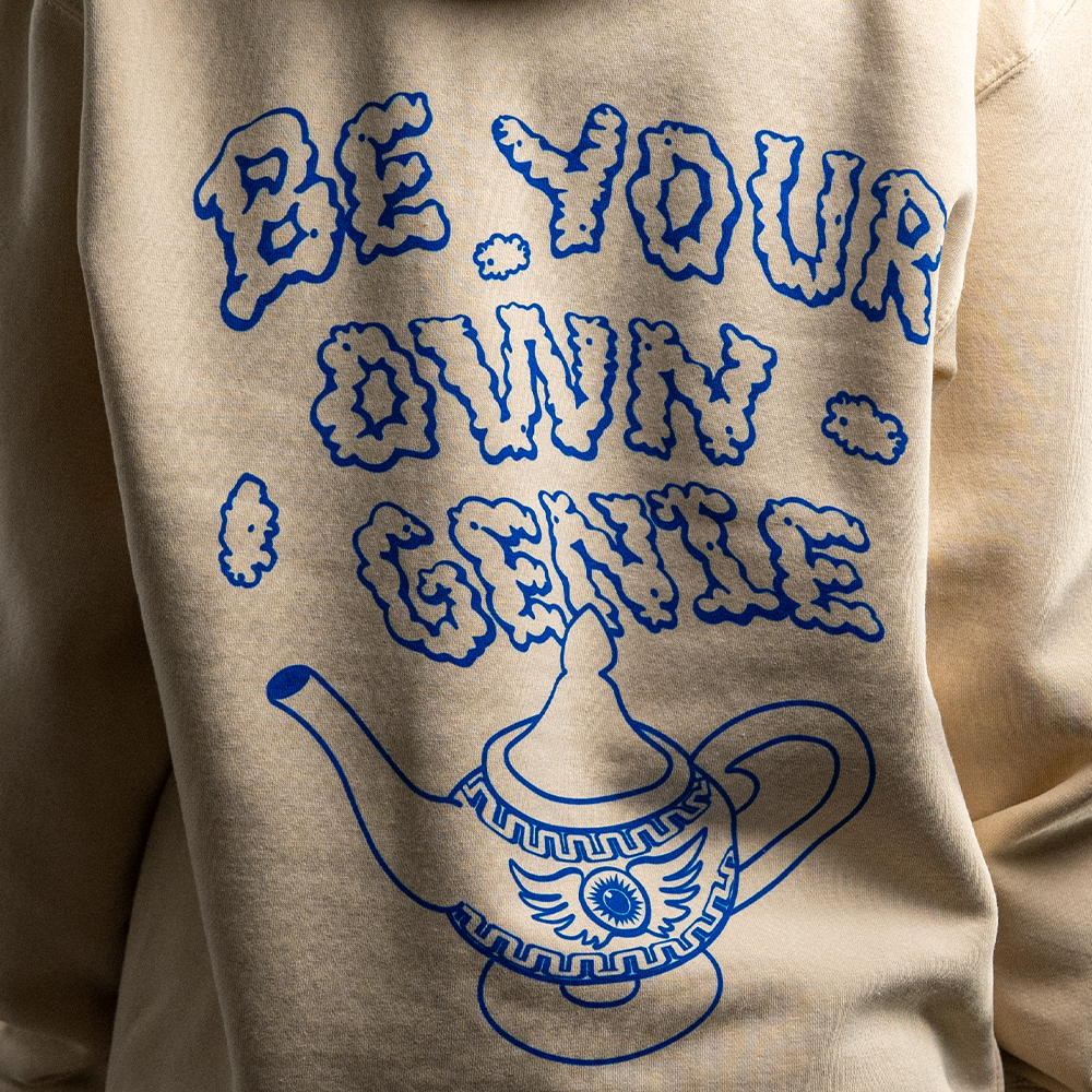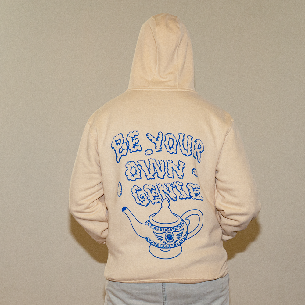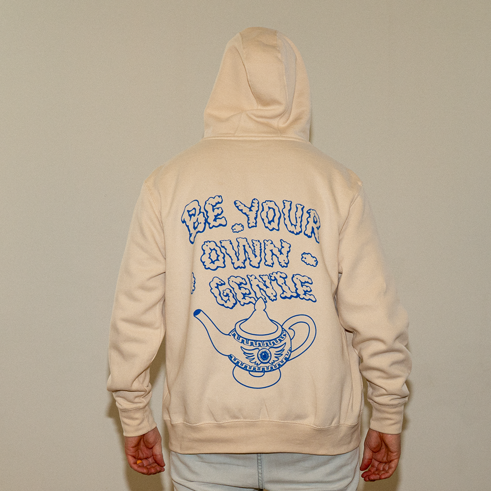 Bring the magic into your everyday look with the Genie Zip Hoodie. This cream-colored fleece is designed to inspire with its bold graphics and everyday wearability. The back showcases an oversized genie lamp surrounded by smoke-styled lettering that reads “BE YOUR OWN GENIE”—a reminder that you hold the power to shape your story. On the front left chest, a smaller lamp design sits beneath smoke-font lettering that spells DMD, tying the design together in bright, electric blue ink.