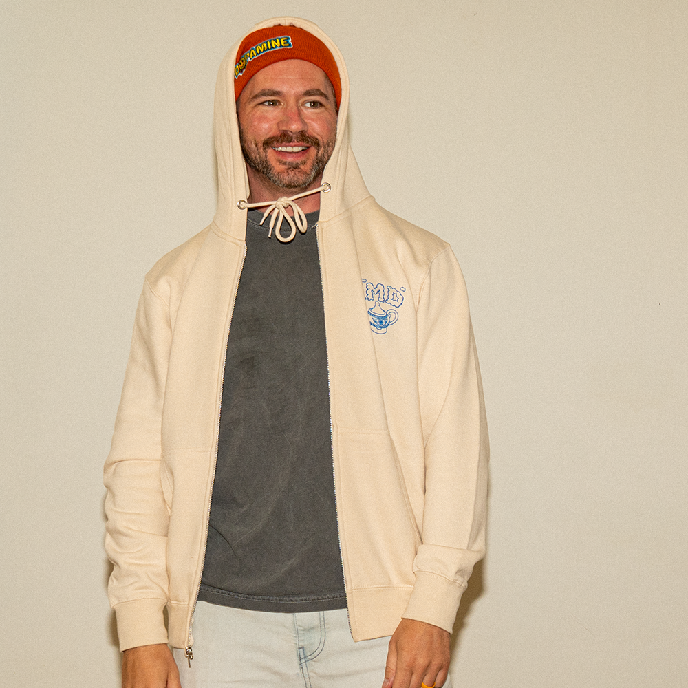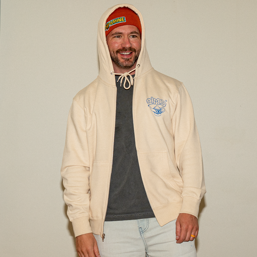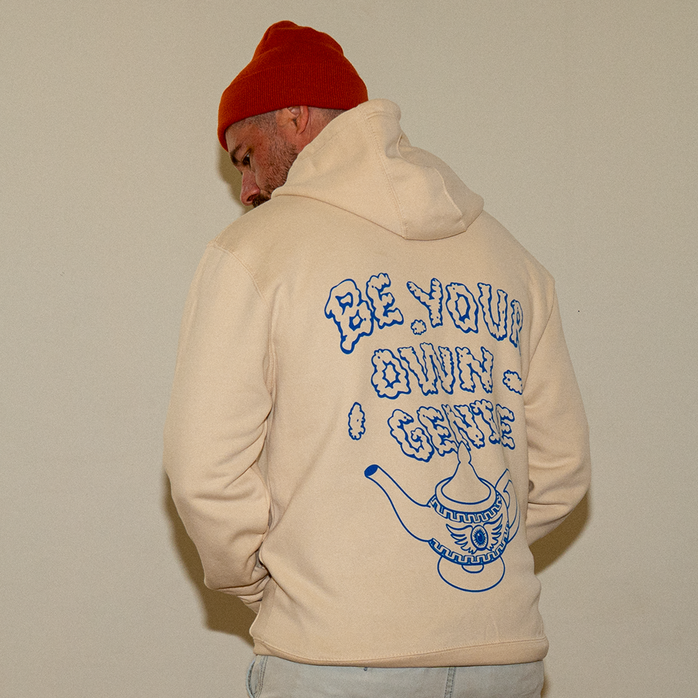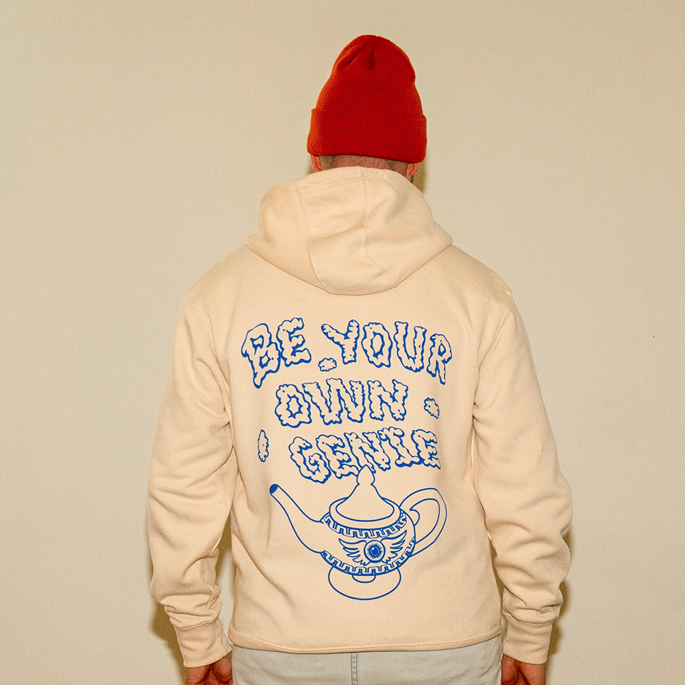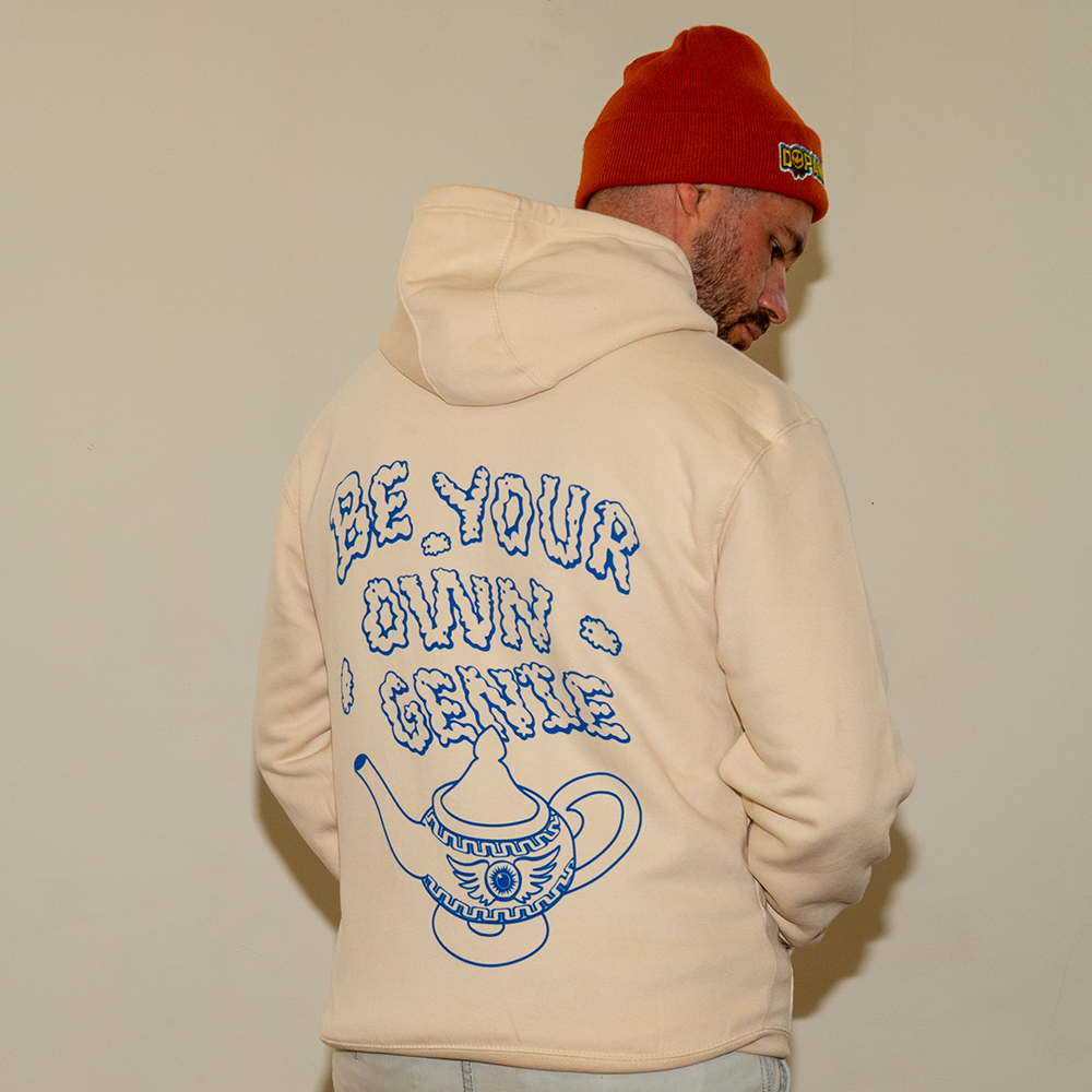Bring the magic into your everyday look with the Genie Zip Hoodie. This cream-colored fleece is designed to inspire with its bold graphics and everyday wearability. The back showcases an oversized genie lamp surrounded by smoke-styled lettering that reads “BE YOUR OWN GENIE”—a reminder that you hold the power to shape your story. On the front left chest, a smaller lamp design sits beneath smoke-font lettering that spells DMD, tying the design together in bright, electric blue ink.