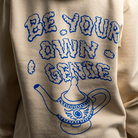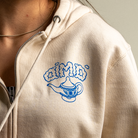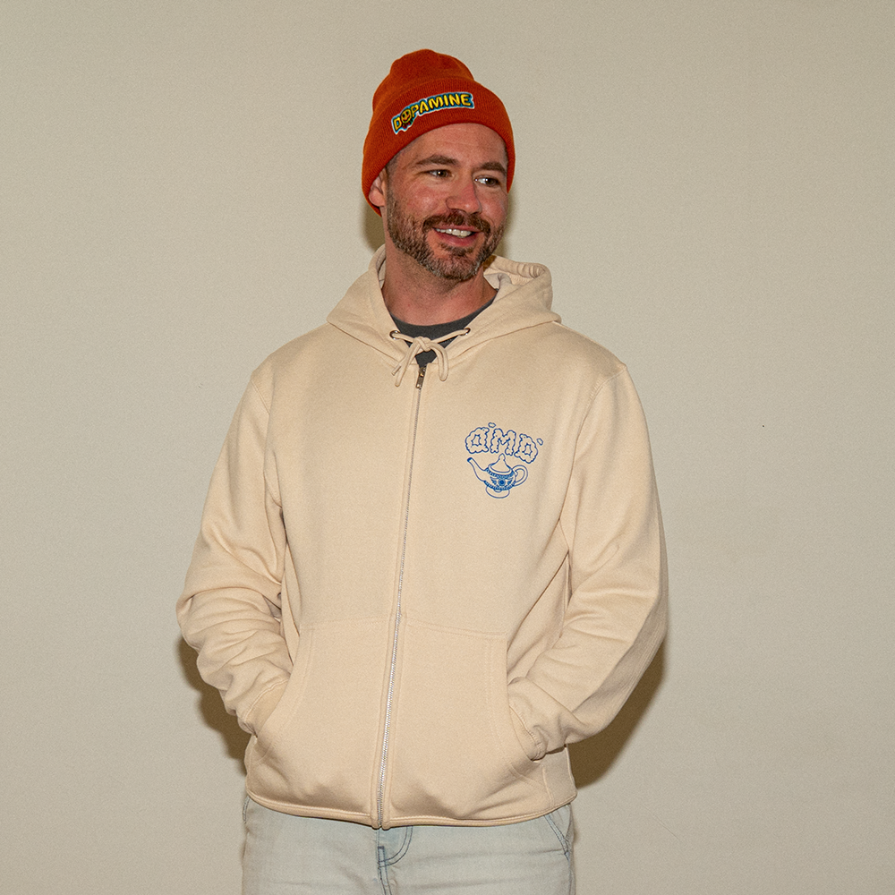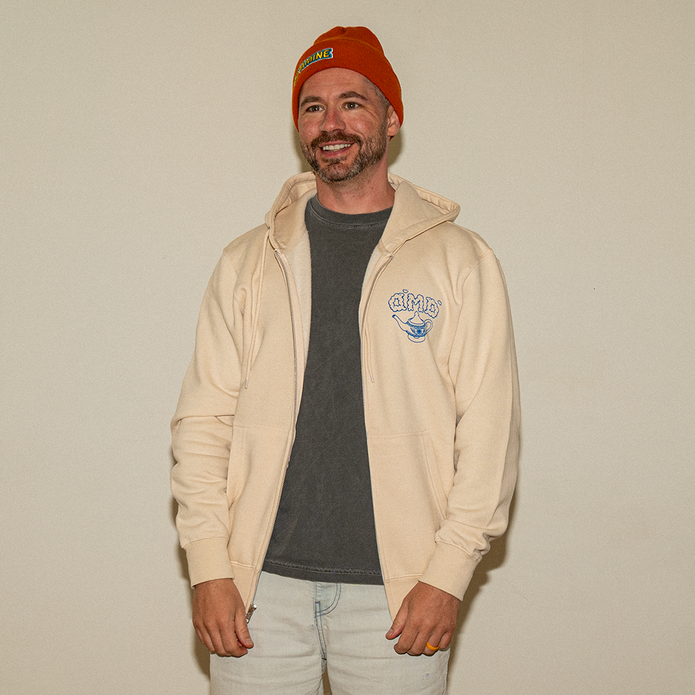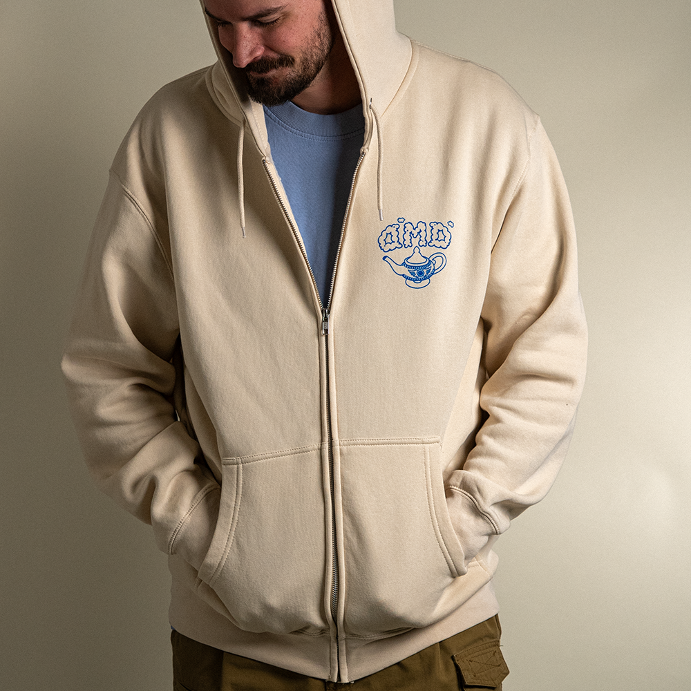 - Cream zip up hoodie with bold blue genie lamp graphics
