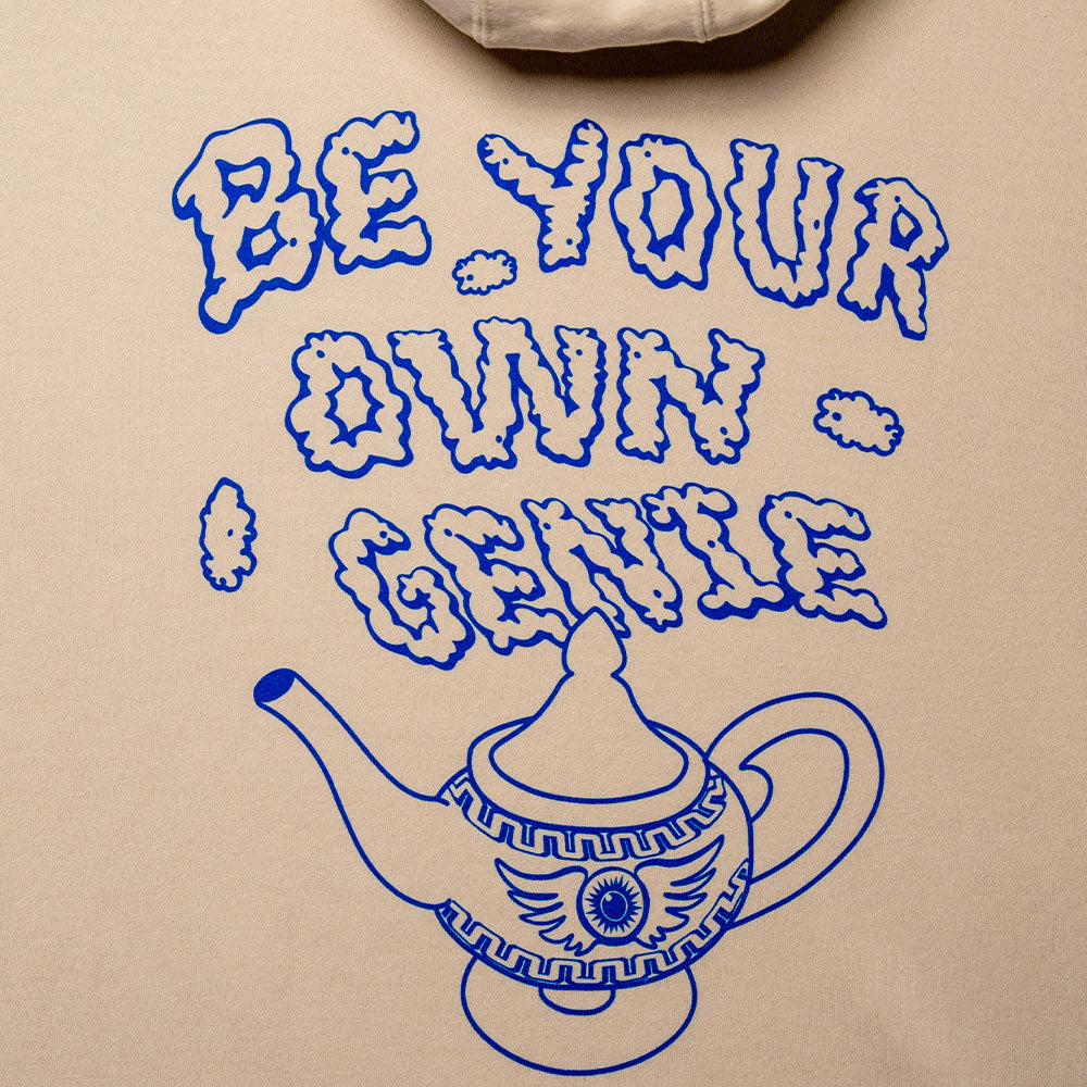 Bring a little magic into your everyday rotation. The Genie Zip Hoodie features bold, electric blue graphics on a cream fleece base, blending statement design with all-day comfort. The back showcases an oversized genie lamp with smoke-style lettering that reads “BE YOUR OWN GENIE,” a reminder that you hold the power to shape your path. A smaller lamp graphic with DMD lettering sits on the left chest, tying the look together.