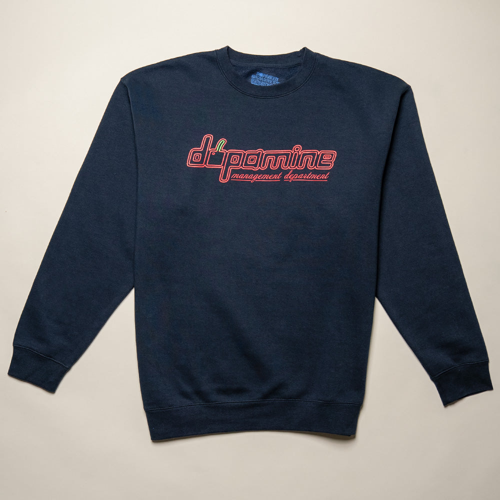 The navy blue base sets the stage for a vibrant front graphic: the word dopamine reimagined in a rounded geometric block font with a playful cherry for the letter “o.” Below, management department in flowing script, balancing clean geometry with organic movement. Designed and screen-printed locally in Denver, Colorado, every detail carries the Department’s mission—exploring self, world, and style.