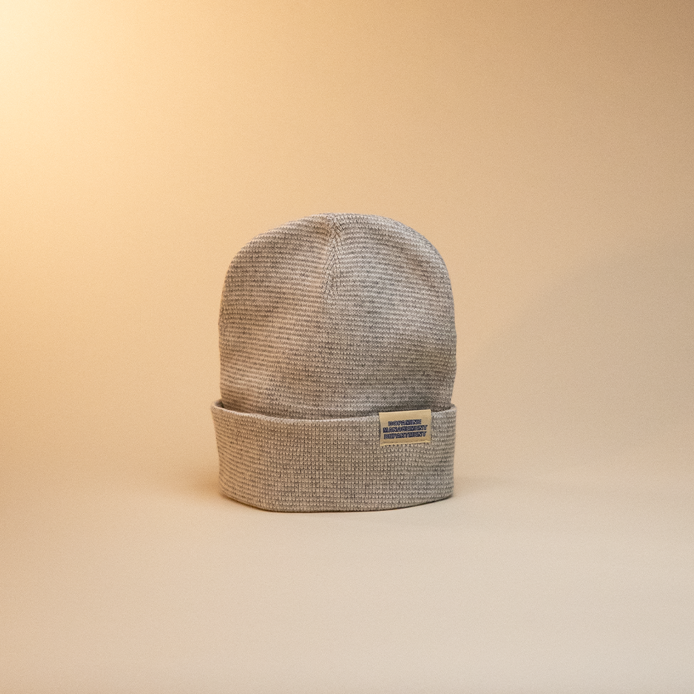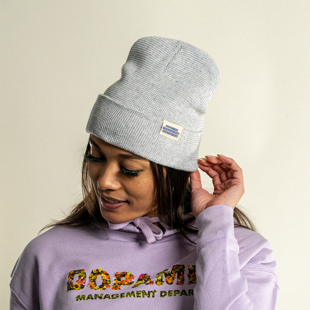 Crafted from a recycled wool & polyester. A sewn off-white label featuring the Dopamine Management Department name in deep blue print gives the piece a subtle but bold identity. Designed and sewn locally in Denver, Colorado, the Heather Beanie represents the brand’s commitment to quality craftsmanship and purpose-driven apparel.