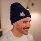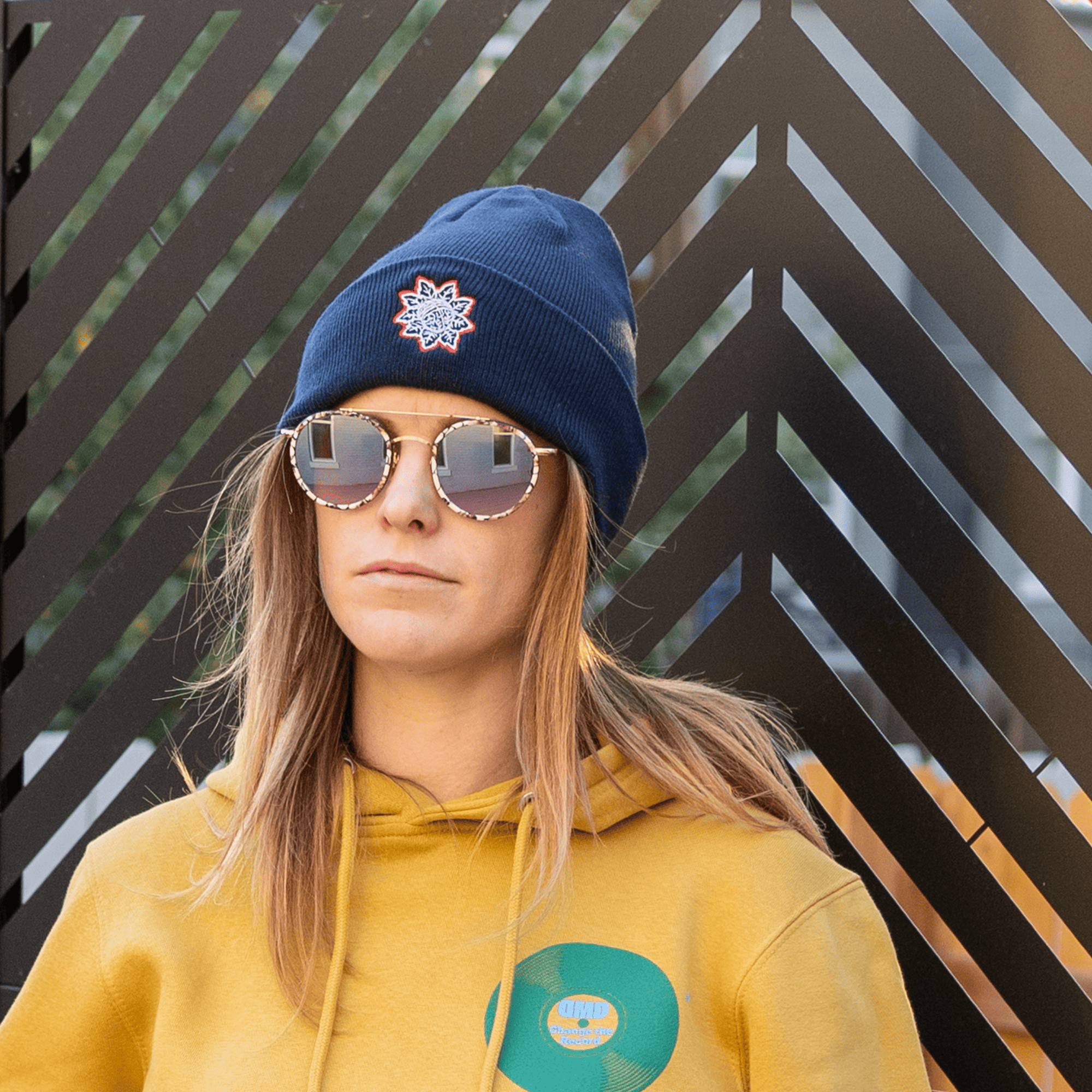 Embroidered mindflower icon outlined in white with a red border, on a navy blue beanie. Thick cuff acrylic. Simple, and eye catching. We like it, we love it, we want more of it.