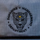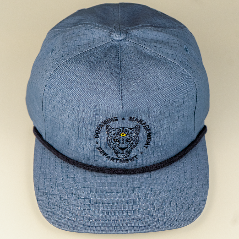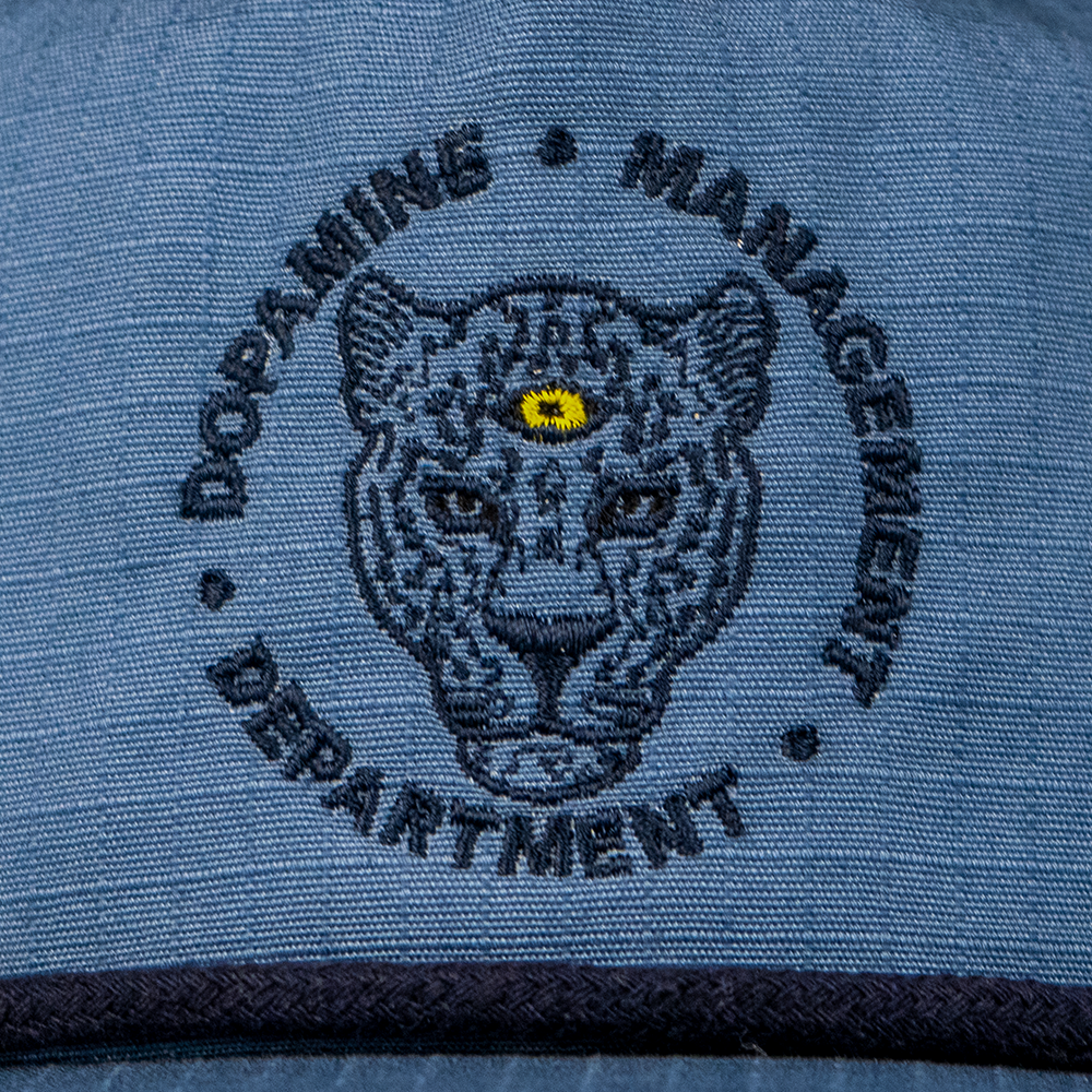 That stoic leopard face with its embroidered third eye is a fierce reminder that all living beings are connected and awake to what’s happening around them. The tonal blue slate fabric and black stitching keep things clean and versatile, while the pop of yellow in the eye adds just enough attitude to stand out in any setting.