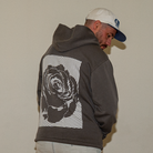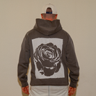 Garment-dyed in a storm grey finish, each hoodie carries a unique character. The back showcases an oversized radial rose graphic, a striking design with a rose silhouette cut from layered concentric lines—symbolizing growth and self-expression. On the front, a vertical “DOPAMINE” print runs along the left chest, echoing the same hypnotic style for a balanced and modern look.