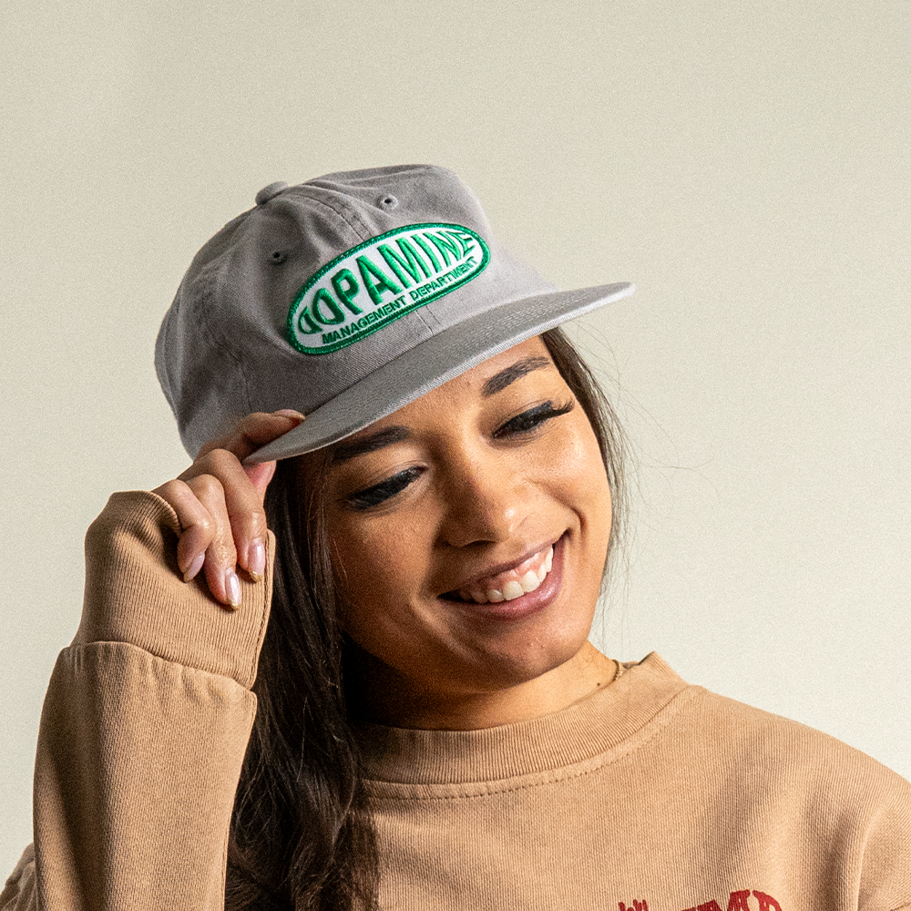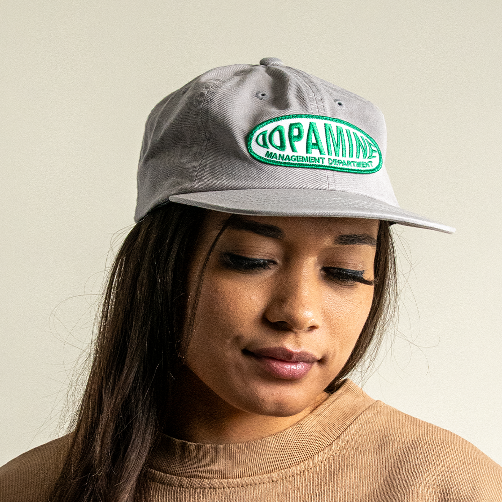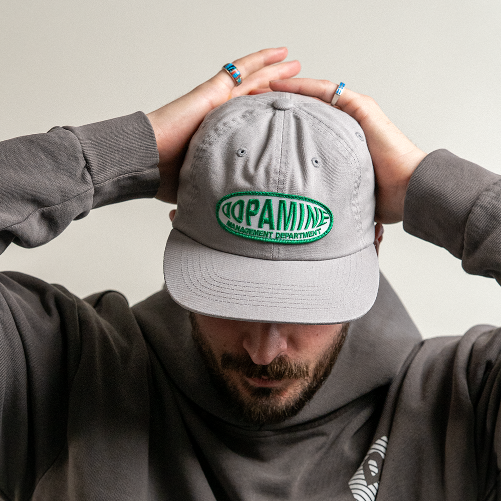 The bold green embroidered patch brings a unique visual element to the look — a warped, stretched logo that embodies what DMD stands for: staying present, exploring inner space, and looking good doing it.