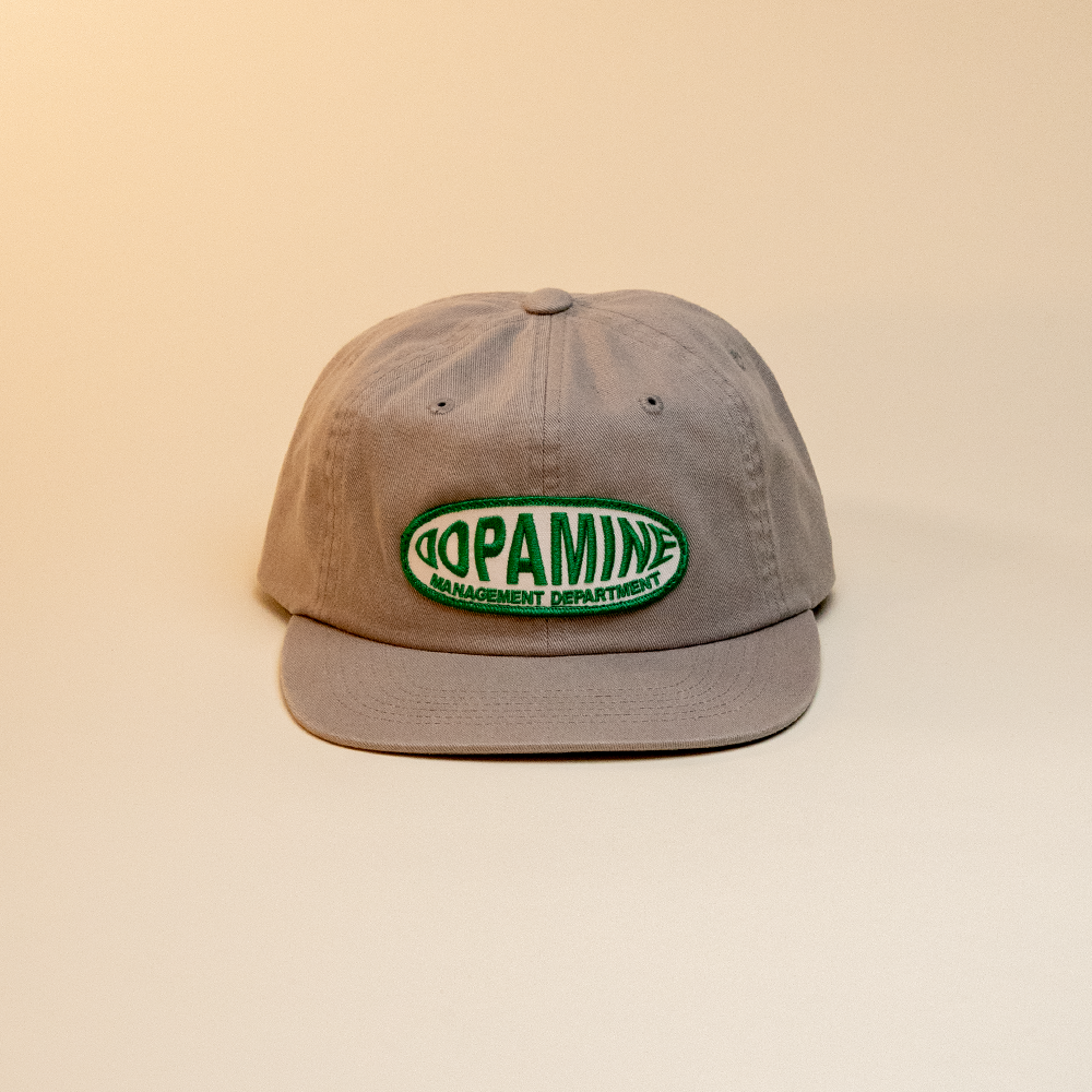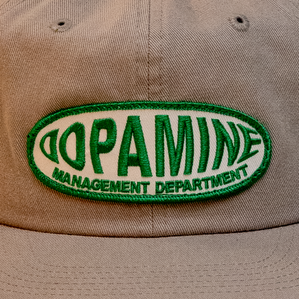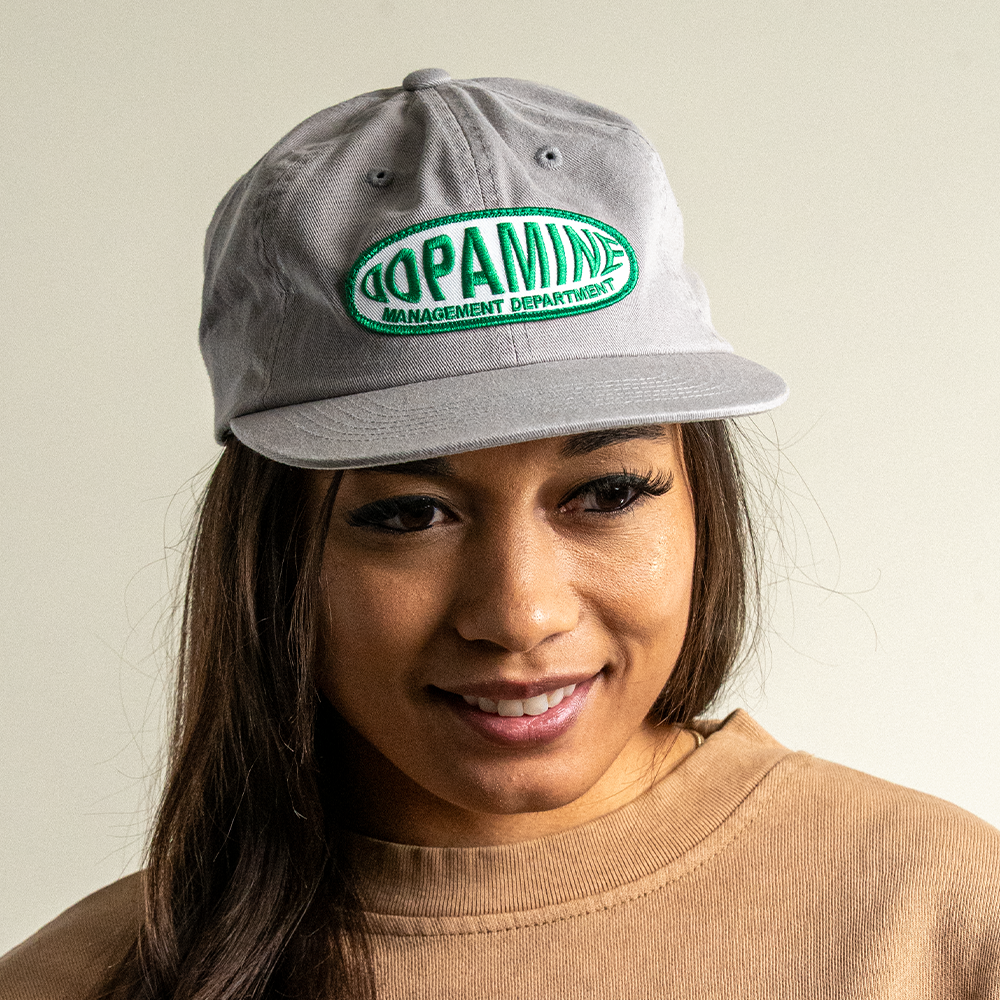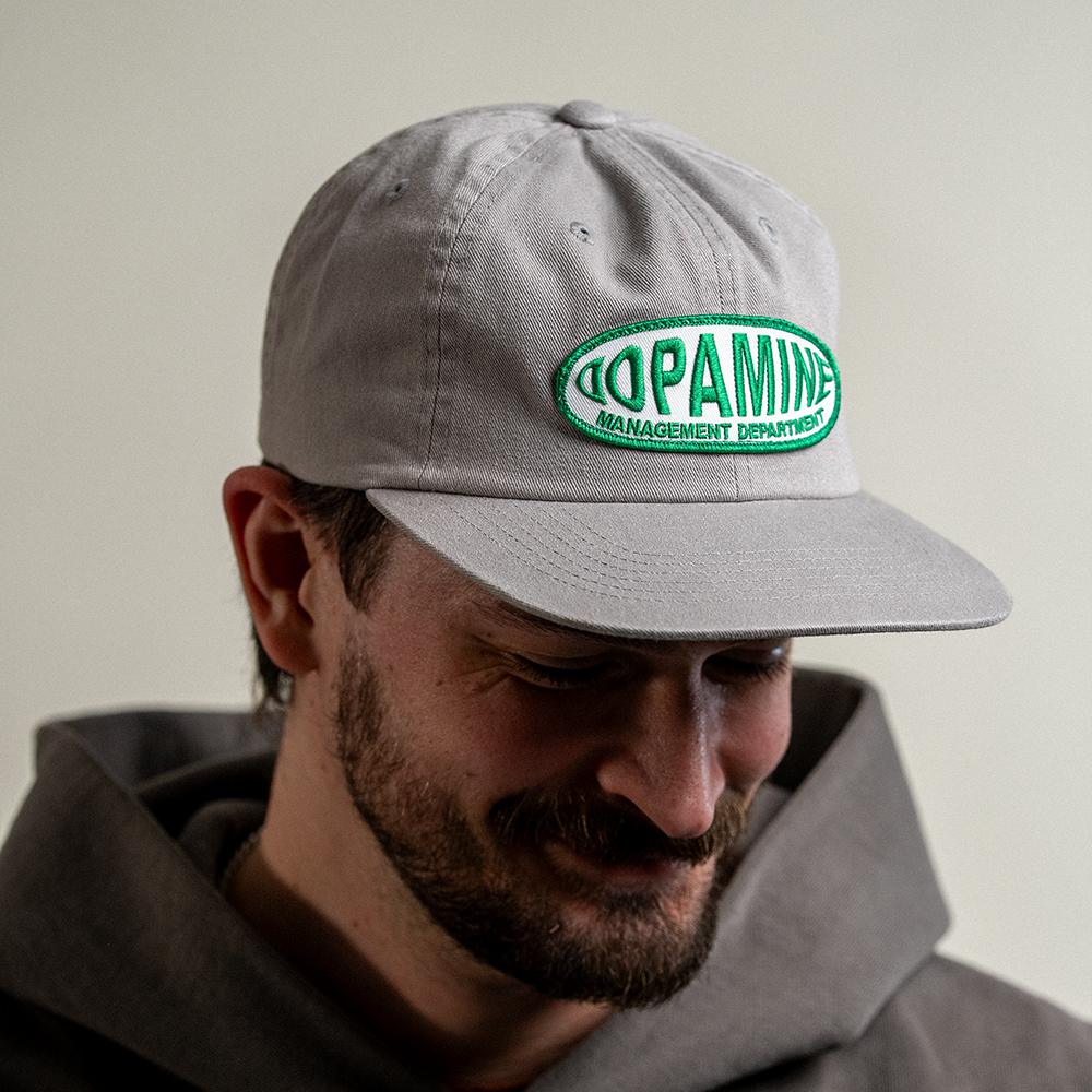 The bold green embroidered patch brings a unique visual element to the look — a warped, stretched logo that embodies what DMD stands for: staying present, exploring inner space, and looking good doing it.