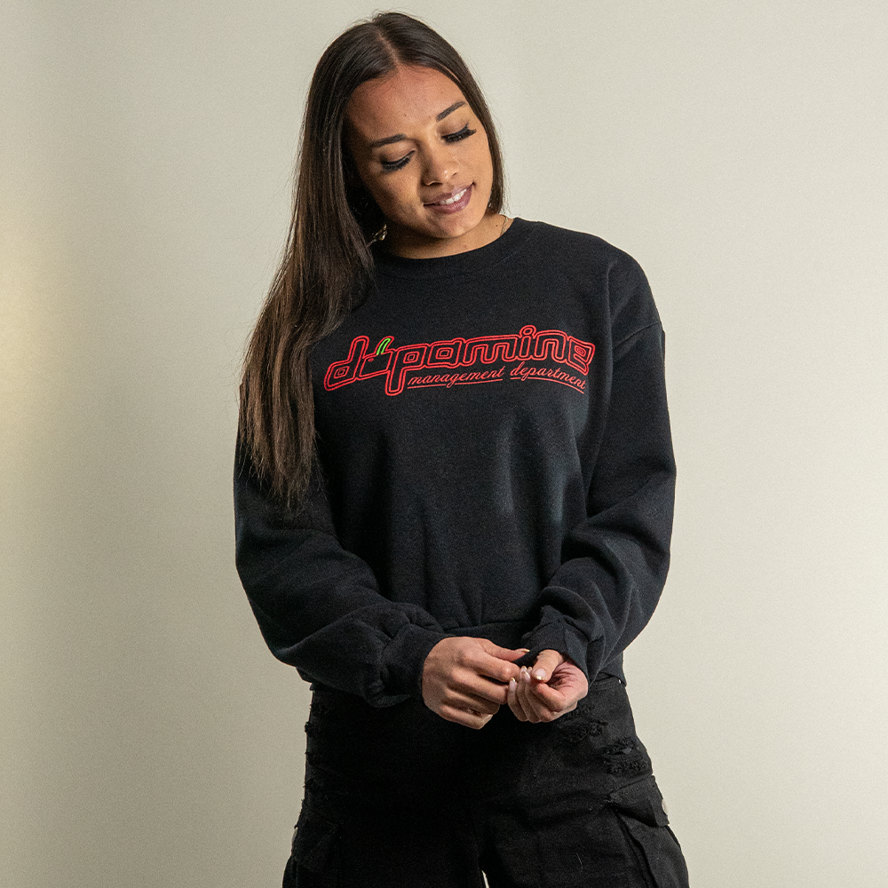 The standout feature is the vibrant front graphic: dopamine written in a rounded geometric block font with a cherry replacing the “o,” complete with a green stem detail. Below, the words management department appear in flowing script, adding a sleek contrast. Made in El Salvador. Designed and screen-printed locally in Denver, Colorado, this piece reflects both streetwear energy and thoughtful craftsmanship.